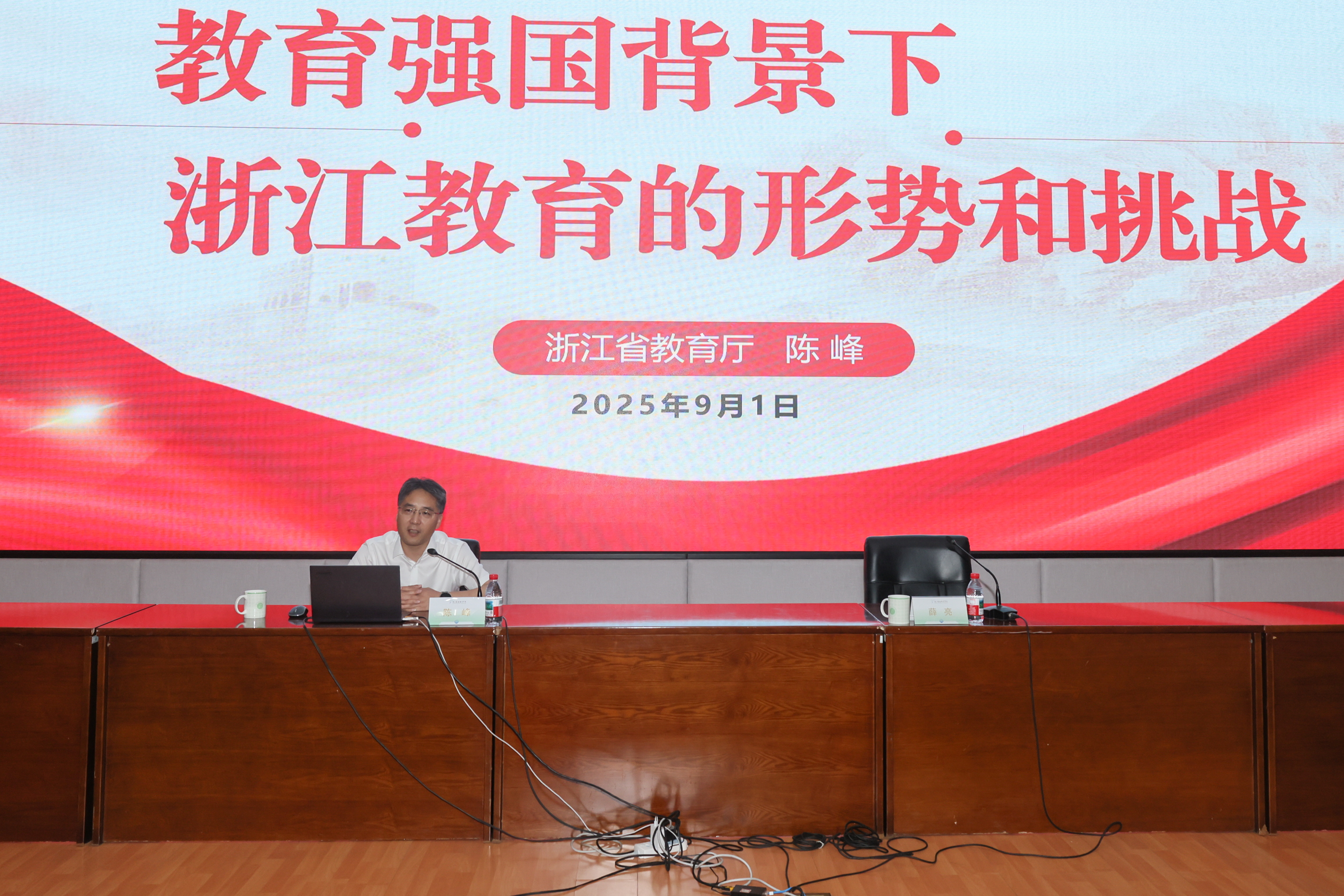 浙江省教育厅党组成员、副厅长陈峰应邀作教育工作专题辅导报告。陈峰深入阐释了新时代教育工作的使命任务,结合浙江教育实际,系统分析全省教育发展目标与路径,强调要增强建设教育强省的责任感使命感,坚持问题导向、改革创新和统筹安全与发展,并为学校高质量发展提供了重要指导。