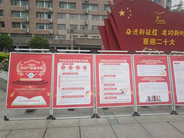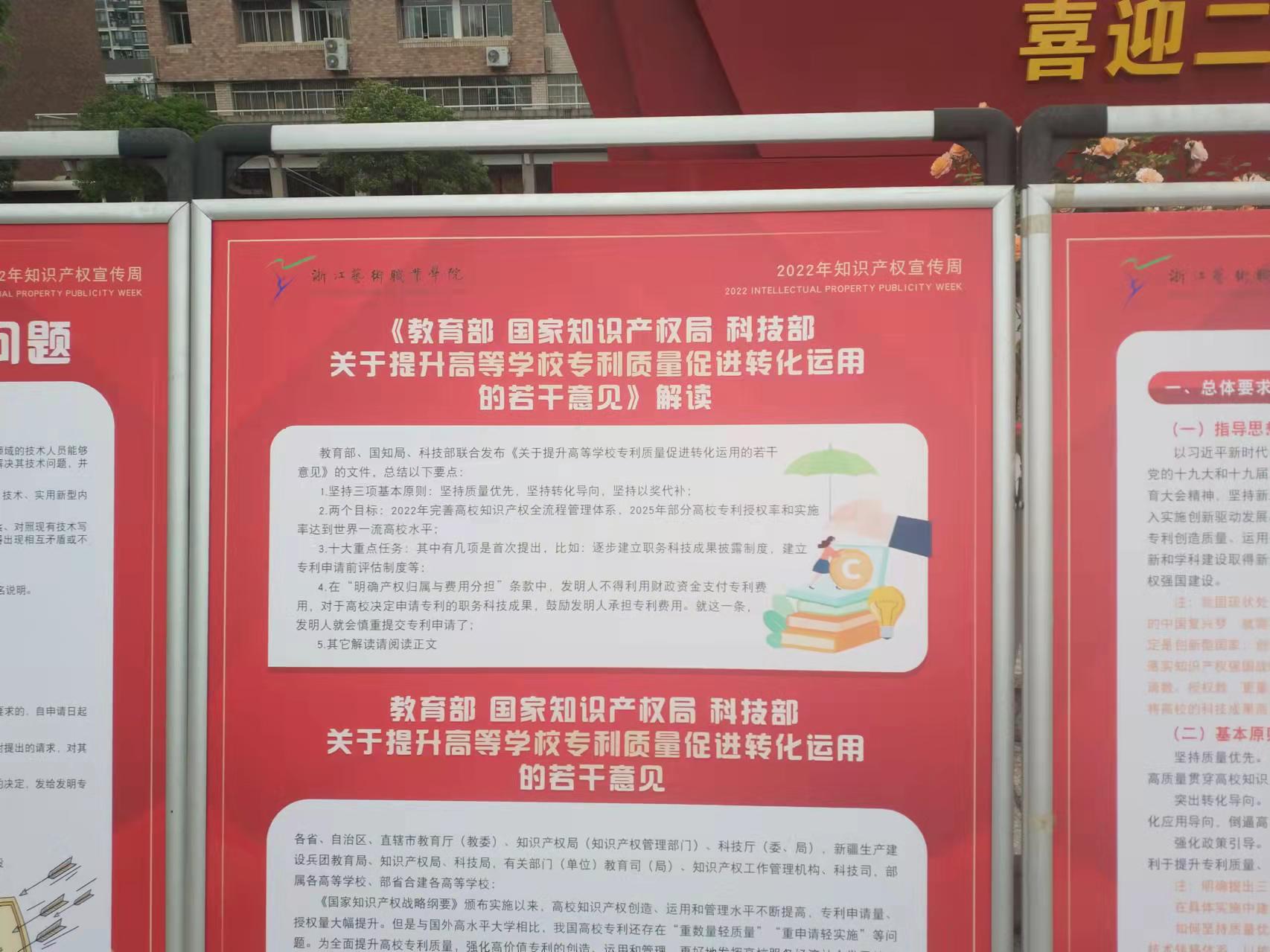 按照浙江省知识产权强省建设工作联席会议办公室《关于组织开展2022年知识产权宣传周活动的通知》要求,为全面提升知识产权保护意识,科研处精心选取了和老师们工作息息相关的专利申请等内容,制作了《教育部 国家知识产权局 科技部关于提升高等学校专利质量促进转化运用的若干意见的解读以及《专利申请流程及有关问题》等十余块宣传展板,4月10日—5月10日在学校中心广场展出宣传,从而加强专利全流程管理、促进科技成果转让,为推动知识产权强国建设纲要实施、打造知识产权强国建设先行省添砖加瓦。