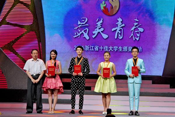 我院舞蹈系陈浩凯同学荣获2015年浙江省“十佳大学生”(图为省委教育工委书记、省教育厅厅长刘希平为陈浩凯颁奖)