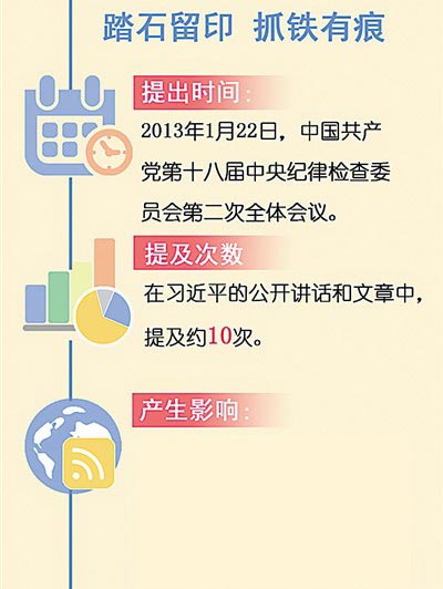 正因如此,在2013年年初,短短1个月内,习近平两度提及“踏石留印、抓铁有痕”:1月22日,习近平在谈改进工作作风、落实八项规定时强调,“要以踏石留印、抓铁有痕的劲头抓下去……让人民群众不断看到实实在在的成效和变化。”2月28日,习近平再次强调,“要以踏石留印、抓铁有痕的劲头抓下去,决不能搞一阵风、一阵子。”