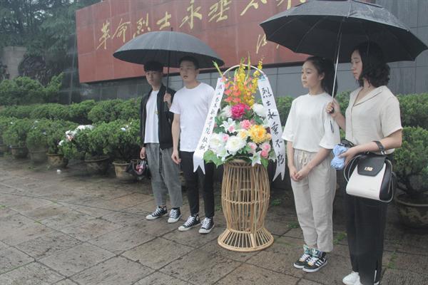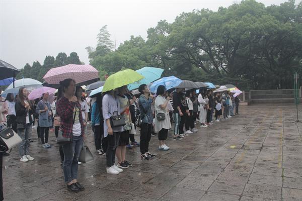 在绵绵细雨里,同学们撑着伞踏着青灰色的台阶向烈士纪念碑走去,一直往上走看到了一块黑色的碑上,碑上刻着裘古怀烈士的遗言:“同志们,胜利的时候,请你们不要忘记我们!”如此质朴简单的遗言,展现出了革命烈士最真挚的内心,他们牺牲自己,为了中华民族的存亡奋不顾身,他们不为名不为利,为的是能够实现自己的价值,面对烈士的遗言,我们的内心充满了火热,他们伟大的形象也会常存于每个人的心中。来到革命烈士纪念馆前,早有其他学校的同学也在举行悼念仪式,缅怀烈士是我们每个人都愿意和值得去做的。在庄严肃穆的革命烈士纪念碑前,伴随着义勇军进行曲我们唱响了国歌,领导老师冒雨做出了缅怀烈士的讲话,献花仪式结束后我们全体学员绕纪念碑一圈感受革命烈士的伟大,在纪念碑的背面写着浙江革命烈士纪念馆是由社会各界人士捐款建造于一九九一落成,结尾的那句话“青山有幸,英烈永存;巍巍丰碑,千古扬名。”是对英烈的赞颂,是历史与人民将会永记他们的决心。