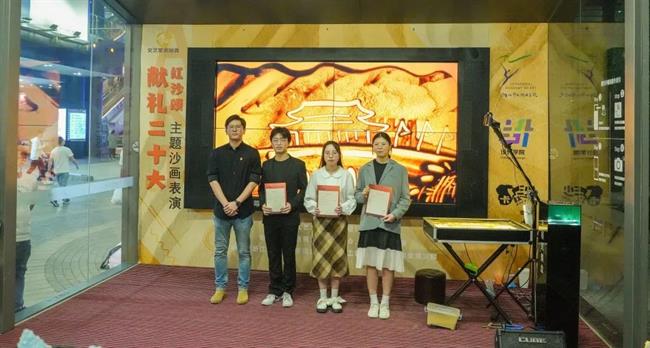 此次活动由设计学院教工第二党支部和学生党支部的党员师生负责选题策划与艺术沙画表演工作,党员们来到活动现场上了一堂“有声有色”的主题党课。