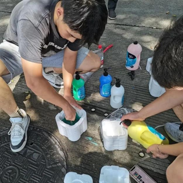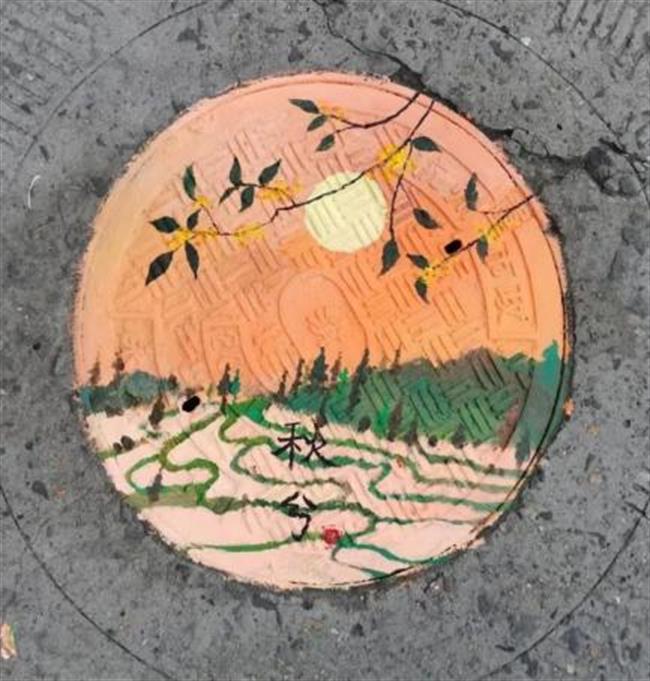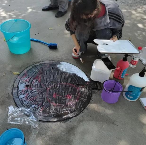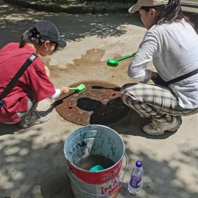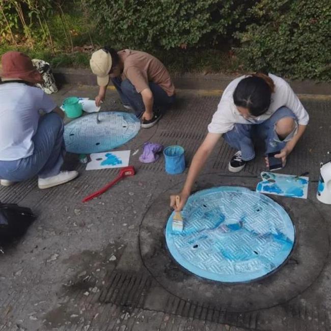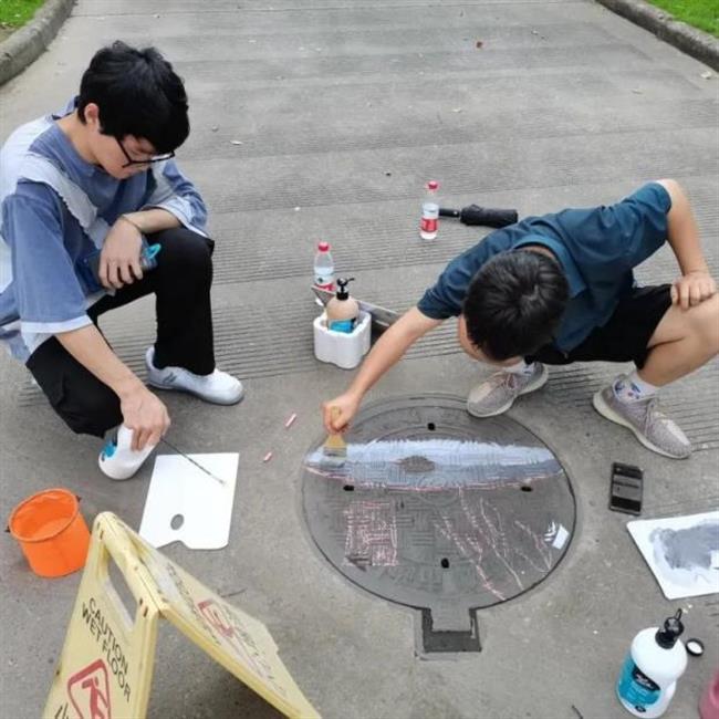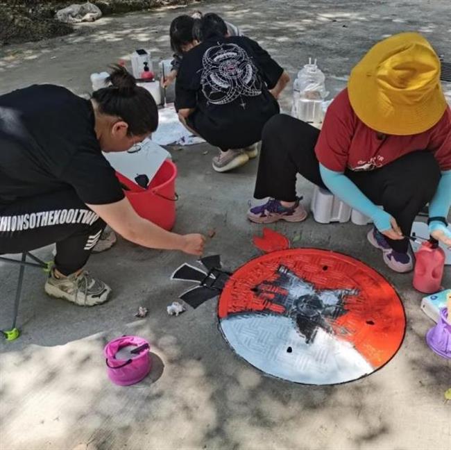 此次井盖涂鸦是由我系19级、20级学生共15人所绘。活动围绕动漫人物、环境保护、运动健康、西湖十景、二十四节气五个主题进行绘画创作。         “为井盖‘化妆’的过程并不算复杂,首先要将井盖清洗干净,用粉笔打个底稿,然后用丙烯颜料填色,晾晒一段时间后,最后用清漆刷一遍固色。”其中一位正蹲在地上的同学笑着说,“烈日下工作确实会有点辛苦,但一想到好的作品能让老师和同学们享受美,就觉得这些都是值得的。”