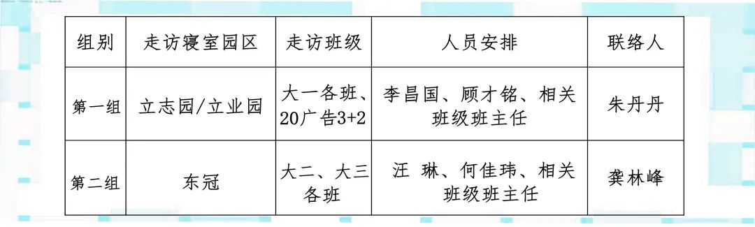 为全面落实学校各项管理教育工作,让班主任充分了解学生的思想动态,更好地关心同学们的学习生活情况,拉近师生之间的距离,设计学院将学生工作重心前移至学生公寓管理中,本月起,今后每月第四周的周三将作为班主任进公寓主题日。具体名单安排如下: