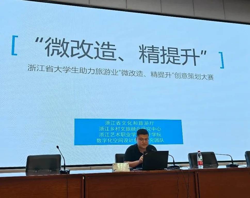 毕存碧对首届浙江省大学生助力旅游业”微改造 精提升”创意策划大赛进行总结回顾,分享了设计学院在暑期开展的乡村振兴“微改造 精提升”社会实践田野调研活动,并围绕第二届大赛的参赛作品要求、主要内容和截止时间进行宣传动员。