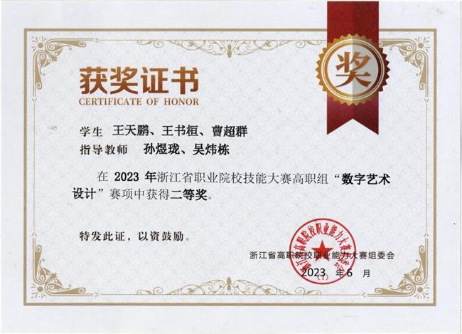 近日,浙江省职业院校技能大赛高职组“数字艺术设计”赛项在浙江机电职业技术学院举行,全省共有来自25所高职高专院校25支队伍参加比赛。经过8个小时的激烈角逐,设计学院由动漫设计专业带头人孙煜珑,专任教师吴炜栋所指导的2021级动漫设计专业王天鹏、王书桓、曹超群三位同学荣获比赛二等奖。