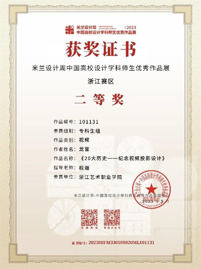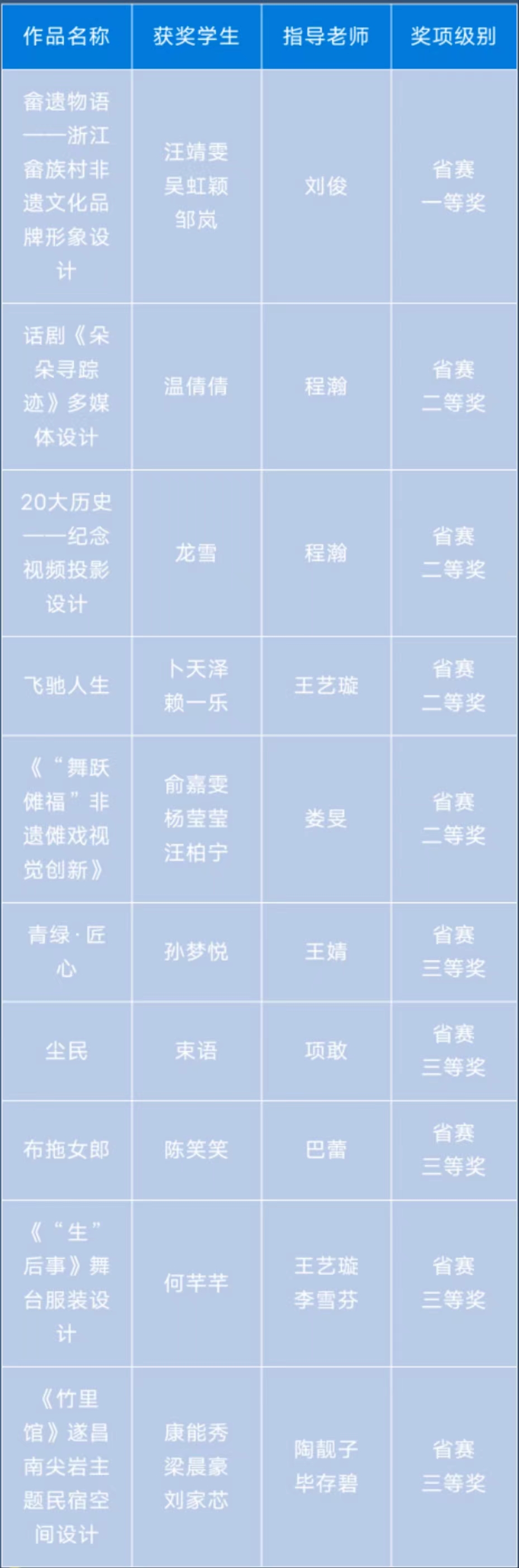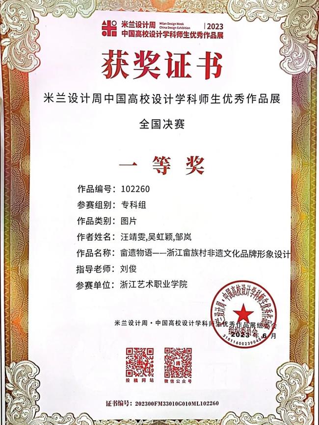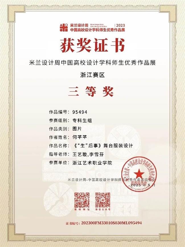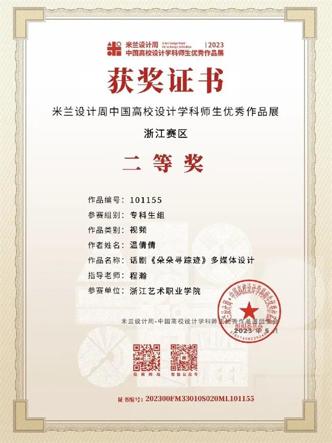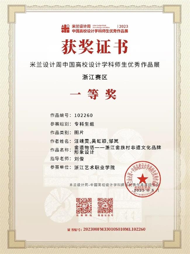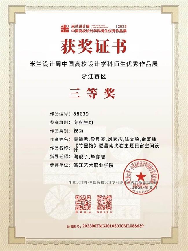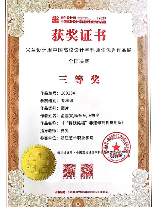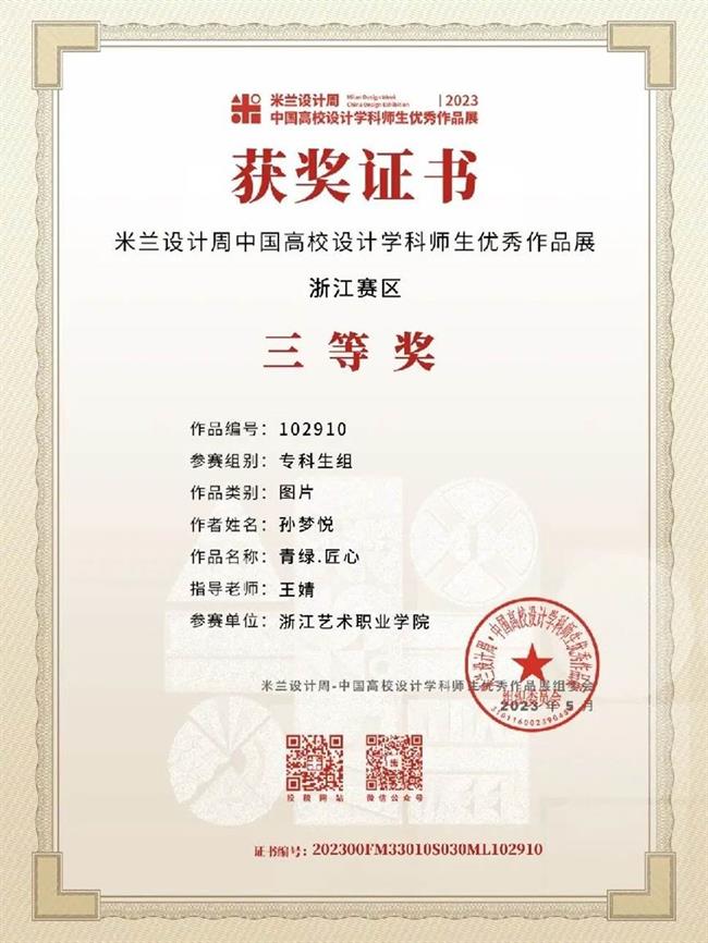 为提高学生运用知识解决实际问题的能力,积极鼓励学生参加各类专业竞赛,培养具有创新精神和实践能力的高素质技术技能人才。近日,由设计学院各专业教师指导的学生作品在2023“米兰设计周——中国高校设计学科师生优秀作品展”中喜获佳绩。经过校内选拔、浙江赛区选拔,作品获得国赛一等奖1项,三等奖1项;浙江赛区获省一等奖1项,二等奖4项,三等奖5项的好成绩。