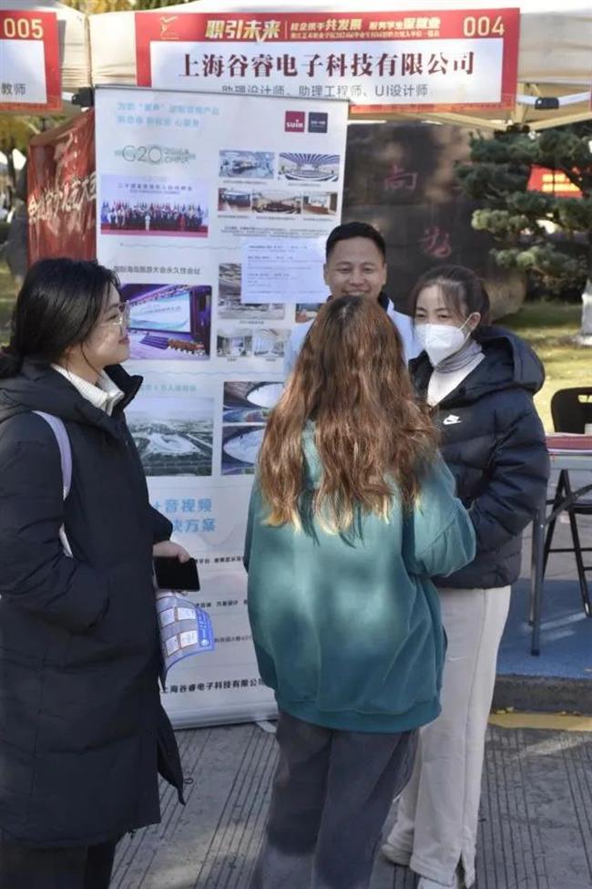 本次招聘会针对设计学院共吸引14家公司参加,提供30余个岗位的放送,包括浙江大丰文化有限公司、哈曼数智视听科技(浙江)有限公司、上海谷睿电子科技有限公司等公司。在招聘会现场,毕业生们准备充分,将自己的专业素养和沟通能力充分展现。