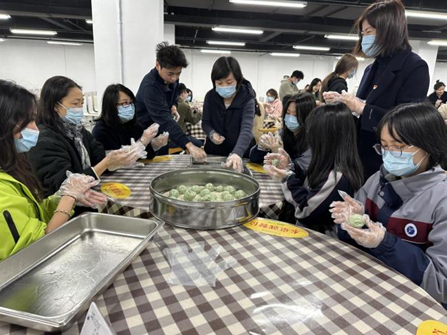 活动现场,热闹非凡。师生们相互配合、团结协作、忙活开来:倒糯米粉、拌艾草汁、揉搓成团、擀皮包馅……互相诉说着自己家乡清明节的习俗。