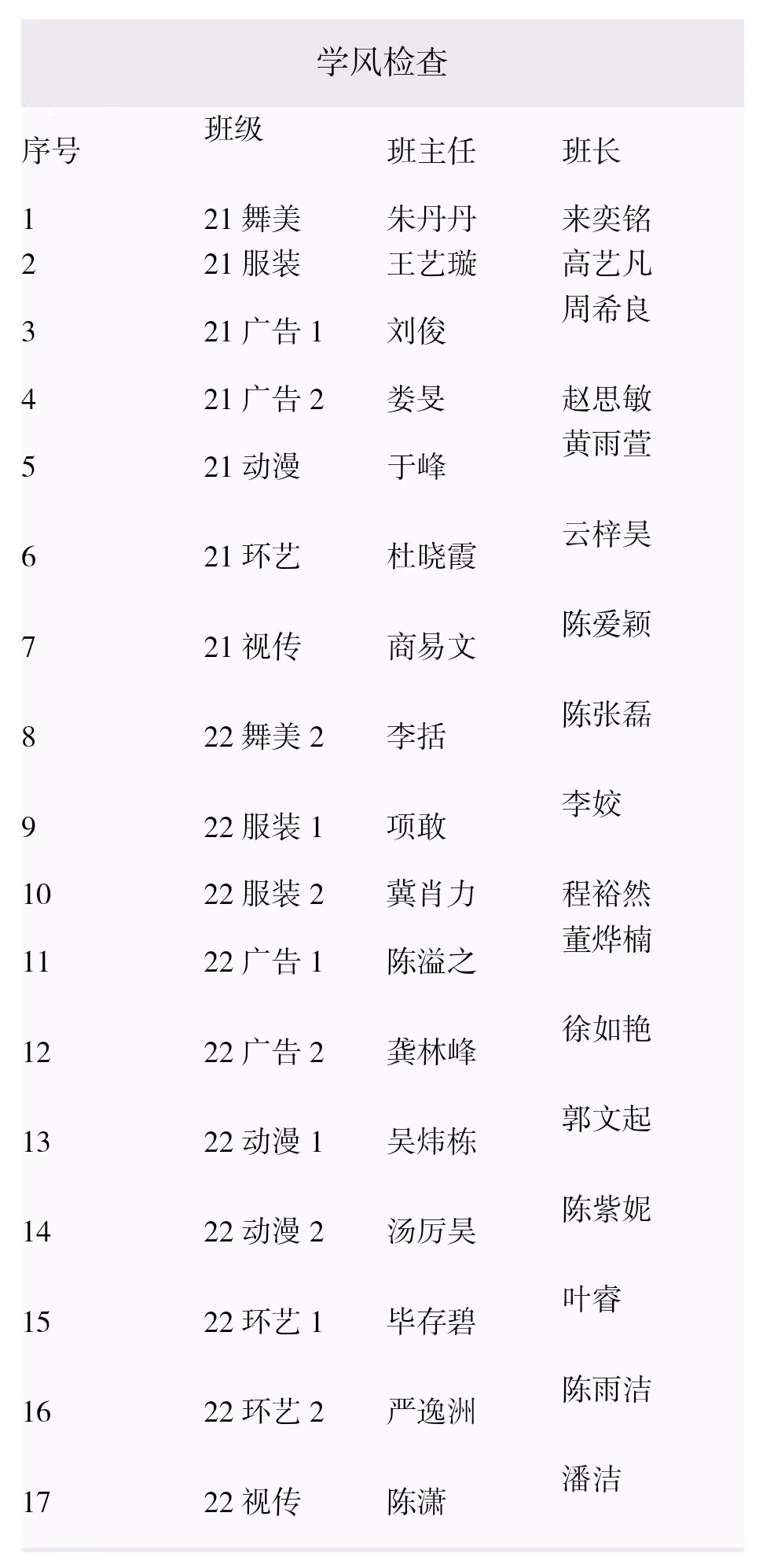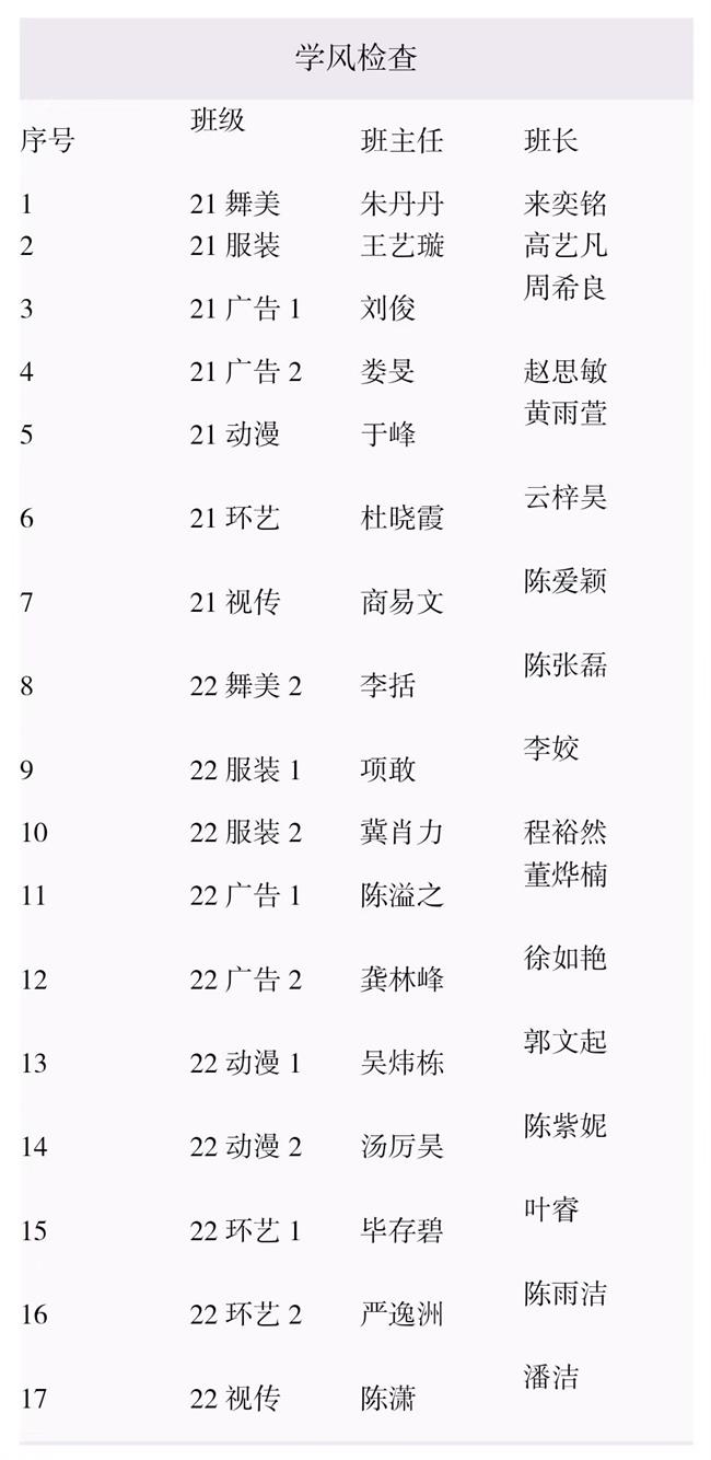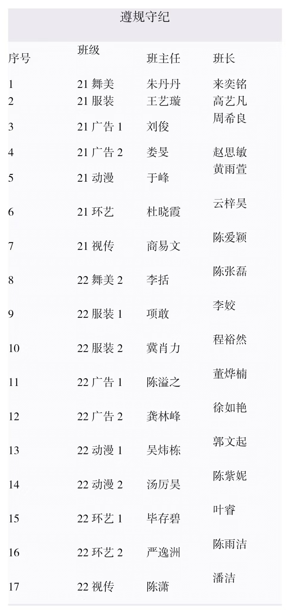 经过检查评比,本期推送4月、5月在课堂考勤、学风检查、公寓考勤、违规违纪检查中表现优异的班级,分别是: