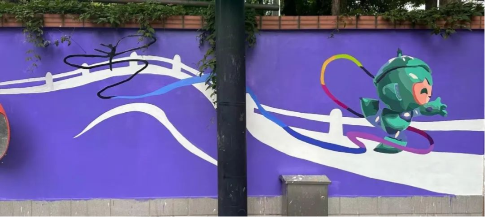 为深入学习贯彻习近平新时代中国特色社会主义思想主题教育,充分发挥高校与社区的合作效能,进一步深化落实党建共建机制,依托专业优势赋能亚运、添彩亚运,6月13日-6月16日,设计学院与滨文社区联合开展“一起来涂‘亚’”墙绘活动。设计学院学生党支部、舞台艺术设计与制作专业师生参加。