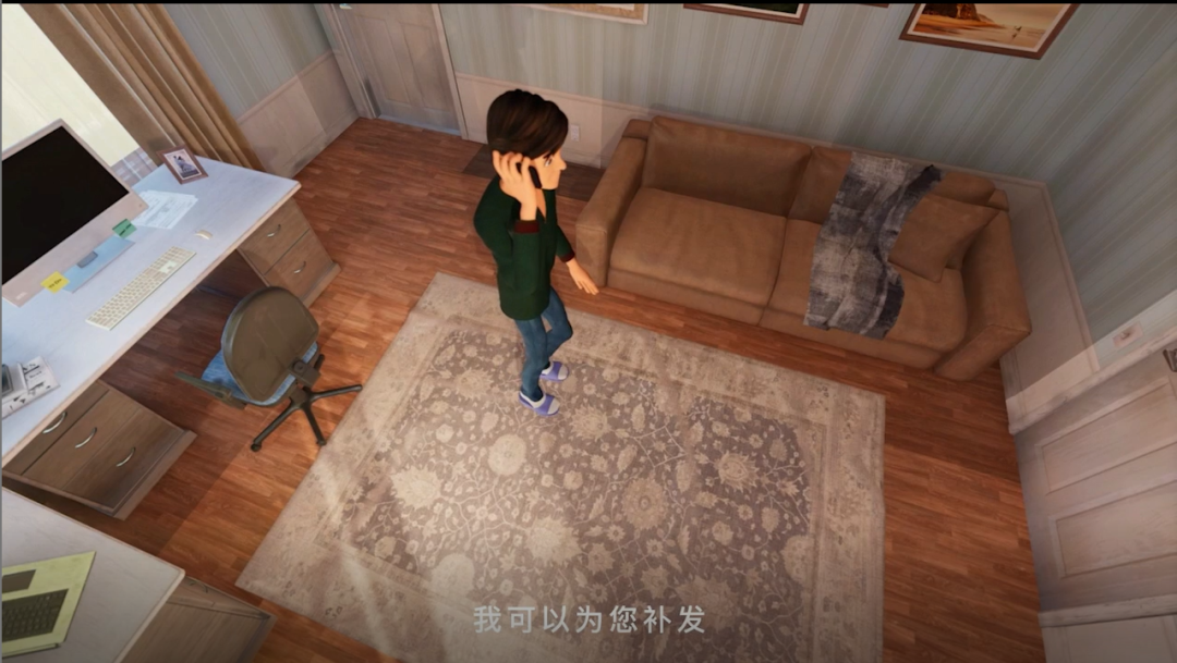 设计说明:三维动画短片《快递风波》短片以宣传全民防诈骗为目的。讲述了骗子冒充快递公司客服,以快递丢件双倍赔偿为由,通过电话引导他人在网络支付平台进行一系列的操作,正当受骗者即将点击确认转账时,正好被快递员送来快递按的门铃声打断,从而使得受骗者及时止损的故事。